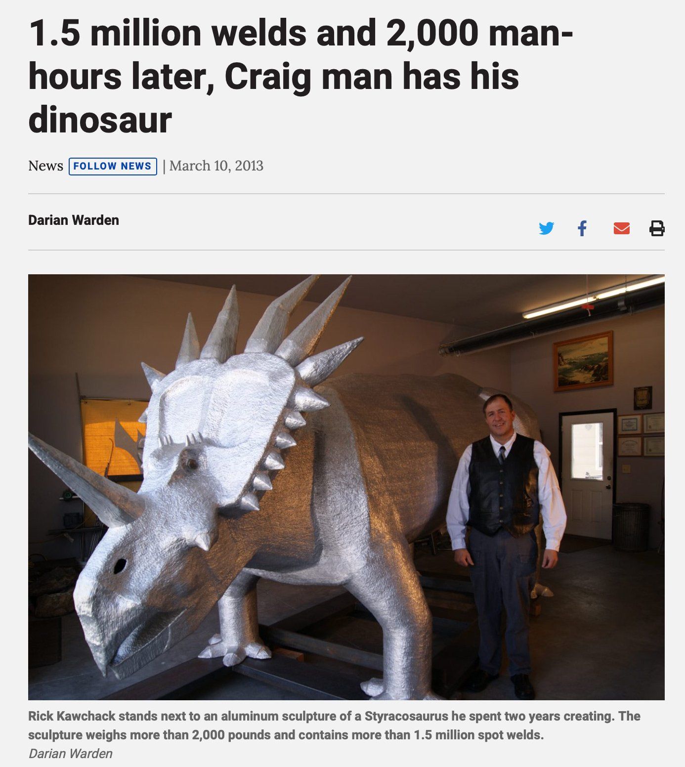 Kawchack completed the massive piece in 2013 after two years and 2,000 hours of work. The life-size likeness was his first venture into creating large-scale art. Constructed from aluminum sheeting, the piece features almost 2 million spot welds on its exterior surface.